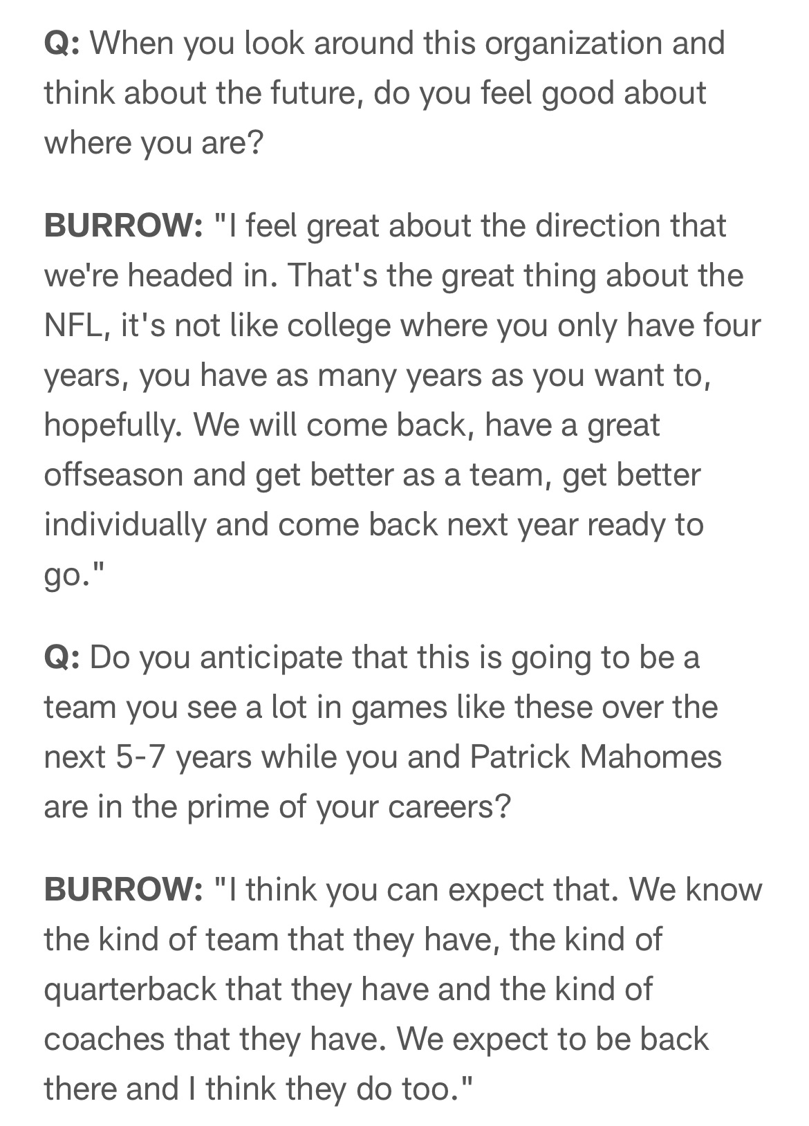 I love Joe Burrow. He’s my dude. But Patrick Mahomes is heralded as the current greatest because he is. No shame in losing to the best. And remember we had ZERO total yards through the first quarter. We got beaten. Straight up.