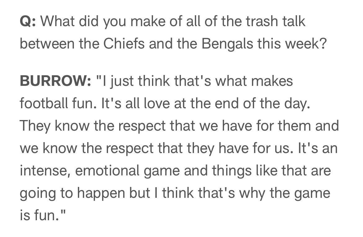 Also, I have no evidence to support this, but I do think we softened up the Bills and their fans by treating Damar Hamlin as kindly as we did. By the time the Bengals marched out onto the field in Buffalo, it was hard to hate us. Mike Hilton solved that problem by calling Arrowhead “Burrowhead.”