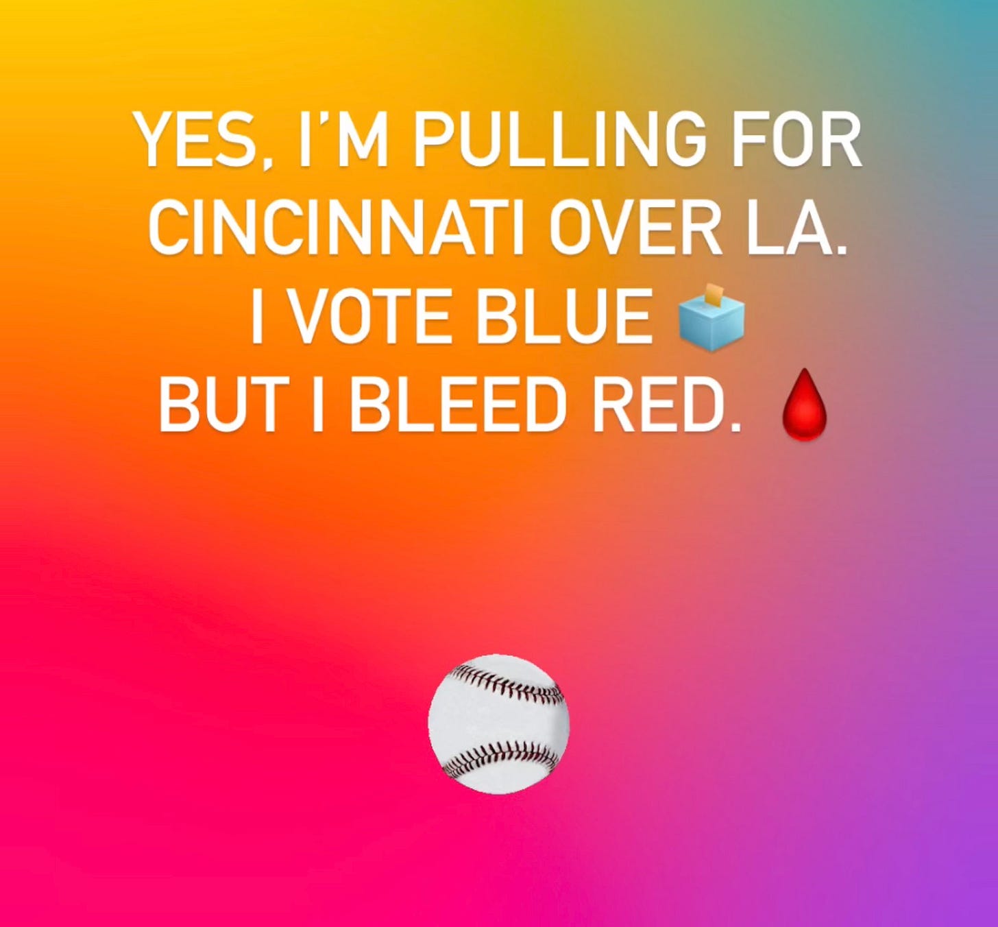 I love the LA Dodgers. They rock my favorite shade of my favorite color. I’ve lived here for 20 years. We live 20 minutes from Dodger Stadium. Many of our friends are fans. But here’s the thing: the Cincinnati Reds have long been my favorite team in any sport. Go, Reds!